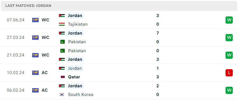 Bên kia, Jordan vẫn cho thấy được sức mạnh và sự tiến bộ khi dễ dàng vượt qua “chú ngựa ô” tại Asian Cup vừa qua là Tajikistan với tỉ số 3-0 ở lượt đấu trước. Với 10 điểm giành được sau 5 lượt trận thì đoàn quân Ammouta cũng đã nắm chắc cho mình một suất tham dự vòng loại thứ 3. Có thể nói, Jordan trong 2 năm vừa qua đã tiến bộ rất nhiều và nếu cứ tiếp tục thi đấu với phong độ cao và form đội hình này, á quân Asian Cup hứa hẹn là đối thủ nặng ký ở vòng kế tiếp.