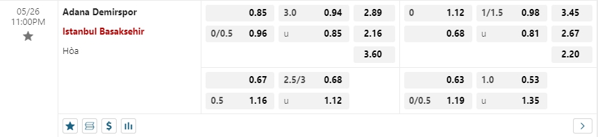 Bảng tỷ lệ kèo bóng đá trận đấu Adana Demirspor vs Basaksehir