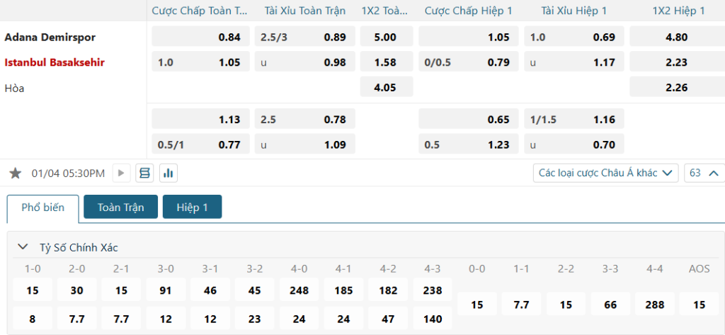 Bảng tỷ lệ kèo bóng đá trận đấu Adana Demirspor vs Istanbul BB
