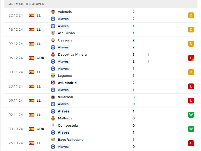 Alaves vừa qua có trận hòa trước Valencia, đây là trận hòa thứ 3 liên tiếp của họ ở 3 vòng đấu gần nhất, trải qua 18 vòng đấu, Alaves có được 4 chiến thắng, 5 hòa và 9 thất bại, mang về 17 điểm và đang xếp ở vị trí thứ 16 trên BXH, hàng công của Alaves mang về 21 bàn thắng cùng hàng thủ nhận 30 bàn thua, 3/5 trận vừa qua của Alaves khép lại từ 3 bàn trở lên, trên sân nhà của mình, hàng công của Alaves có được 9 bàn thắng cùng hàng thủ nhận 9 bàn thua sau 8 trận đấu.