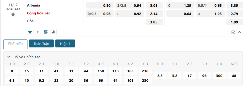 Kèo Châu Âu hiện vẫn đang là sự nhỉnh hơn dành cho đội khách CH Séc, tuy nhiên sự chênh lệch giữa hai mức ăn cũng là không quá đáng kể (2.14 so với 3.05). Điều này cho thấy, Albania vẫn đang nhận được rất nhiều sự tin tưởng, bất chấp việc họ đã từng thua 0-2 ở lượt đi. Với lợi thế được chơi trên sân nhà và phong độ hồi sinh, Albania chắc chắn sẽ mang đến nhiều ẩn số và khiến Séc phải ôm hận.