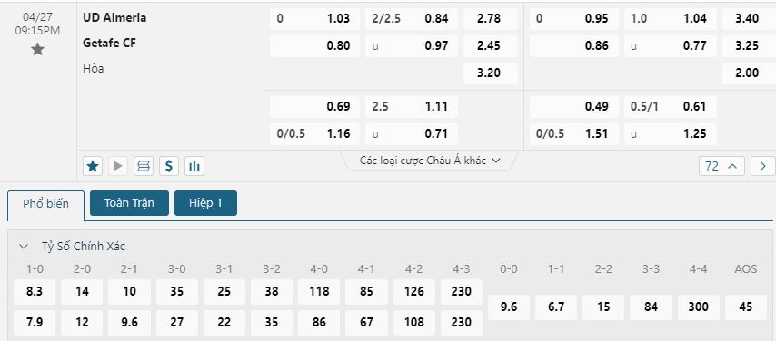 - Chọn Almeria +1/4 FT (kèo phụ)