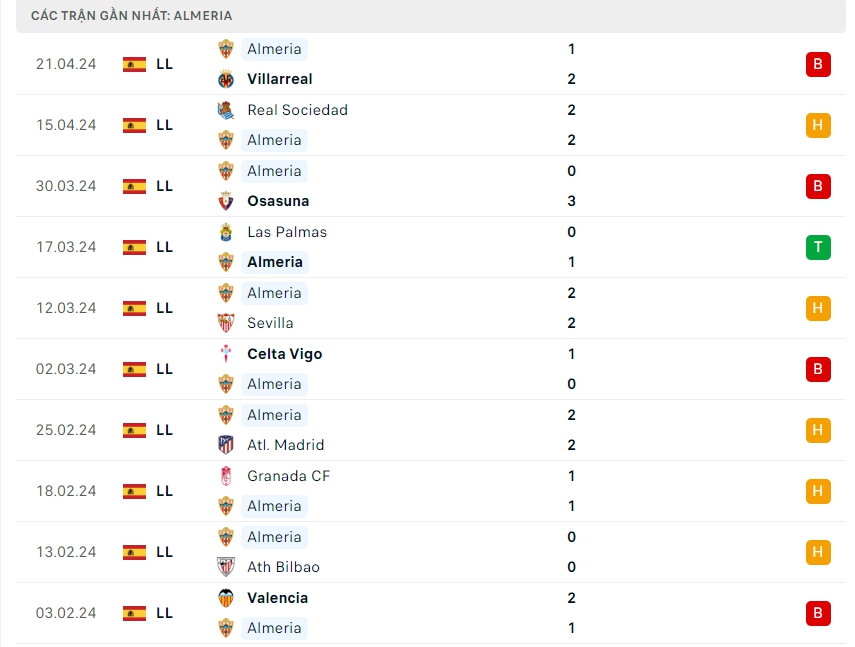 Almeria vừa qua tiếp tục đón nhận thất bại trước Villarreal, với chỉ có được 1 chiến thắng ở 10 trận vừa qua đang khiến Almeria gặp rất nhiều khó khăn ở mùa giải năm nay, với chỉ 14 điểm sau 32 lượt trận, chủ nhà đang xếp vị trí cuối cùng trên BXH, ở mùa giải năm nay Almeria sở hữu hàng công thi đấu không quá tốt với 31 bàn thắng có được nhưng hàng thủ thi đấu quá tệ với 64 bàn thua khiến họ đang đứng trước nguy cơ rớt hạng khi bị nhóm an toàn bỏ xa đến 16 điểm.
