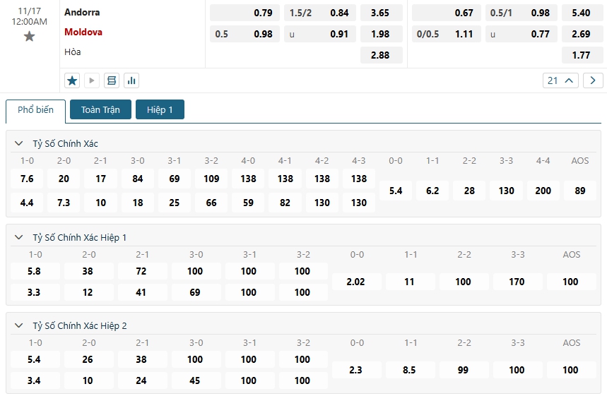 Kèo châu Âu đang là sự ưu ái của Moldova khi tỷ lệ cho chiến thắng của các vị khách là 1.98 trong khi con số này bên phía của chủ nhà là 3.65. Chênh lệch là đủ để Moldova hoàn thành mục tiêu 3 điểm, qua đó tiếp tục giữ vững ngôi đầu của mình.