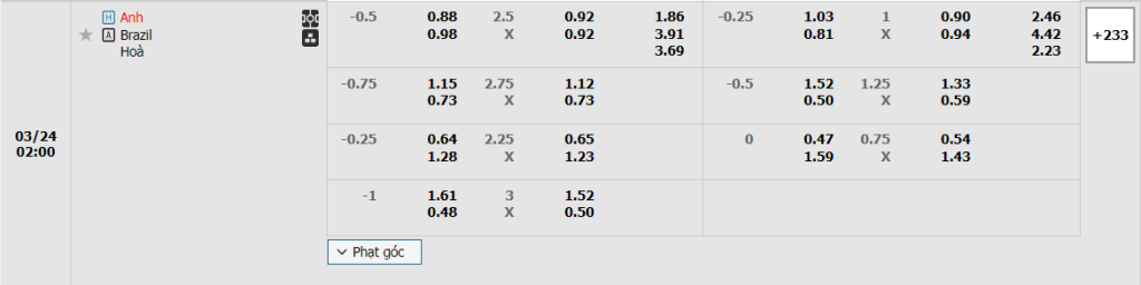 Chẳng có gì lạ khi kèo Châu Âu vẫn đang là sự nhỉnh hơn dành cho Tam Sự, mức ăn của họ là 1.86 và con số này của các vị khách là 3.91. Phong độ nghèo nàn cùng với tinh thần rệu rã và hơn hết là những cái tôi quá lớn đến từ từng cá nhân chắc chắn sẽ là thứ nhấn chìm Brazil trong chuyến đi sắp tới. Dù trận đấu không mang quá nhiều ý nghĩa nhưng ĐT Anh chắc chắn sẽ đặt tối đa sự quyết tâm.