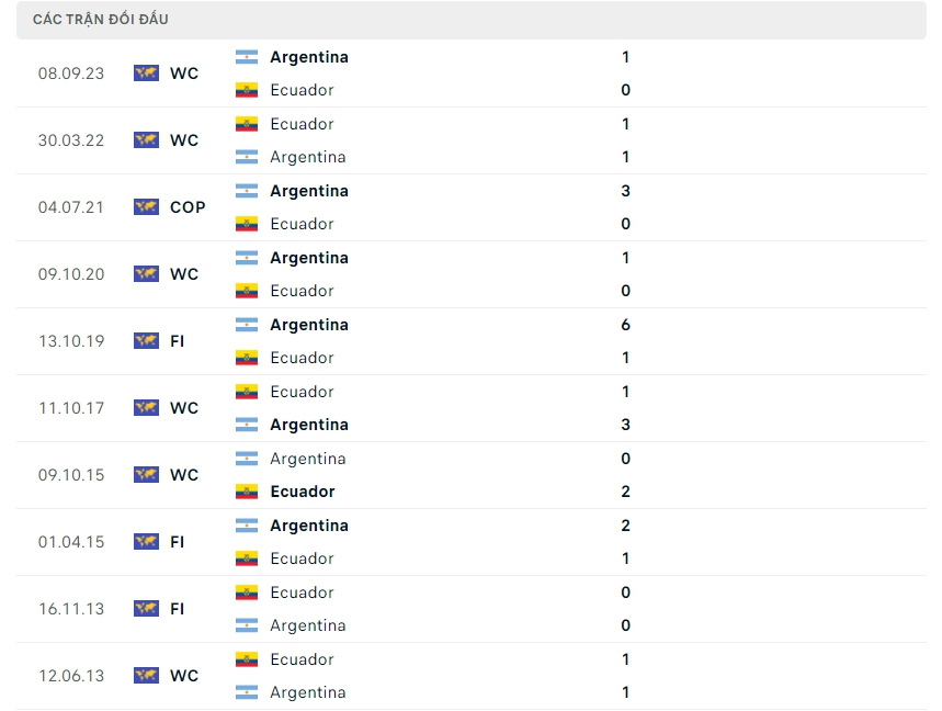 Lịch sử thi đấu của Argentina vs Ecuador