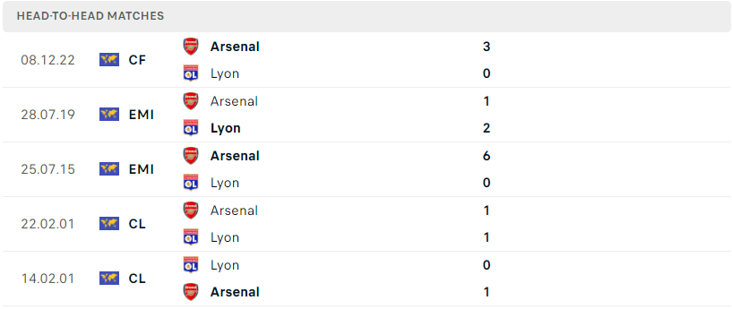 Thành tích đối đầu của Arsenal vs Lyon
