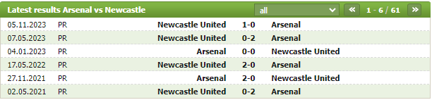 Lịch sử thi đấu của Arsenal vs Newcastle United