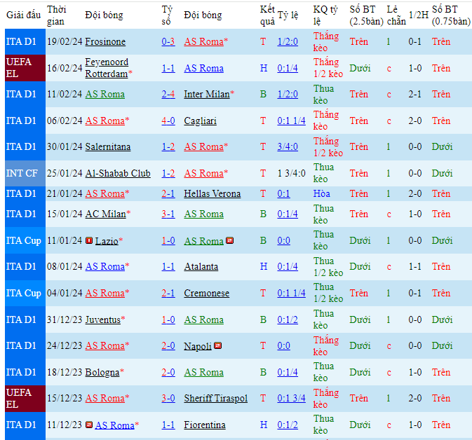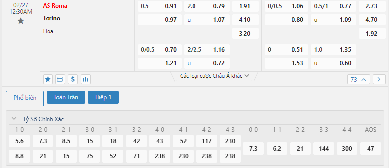 - Chọn AS Roma -0.5 FT