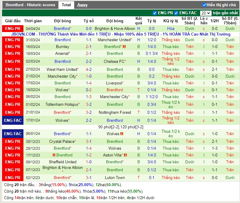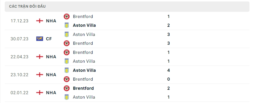Lịch sử thi đấu của Aston Villa vs Brentford