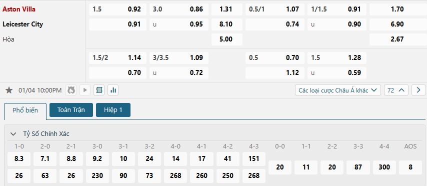 Bảng tỷ lệ kèo bóng đá trận đấu Aston Villa vs Leicester City