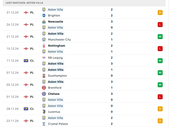 -Phong độ Aston Villa