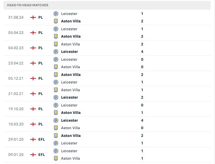 Lịch sử thi đấu của Aston Villa vs Leicester City