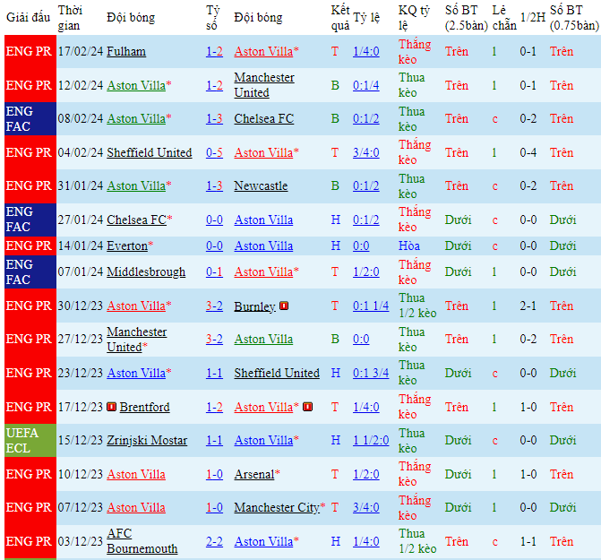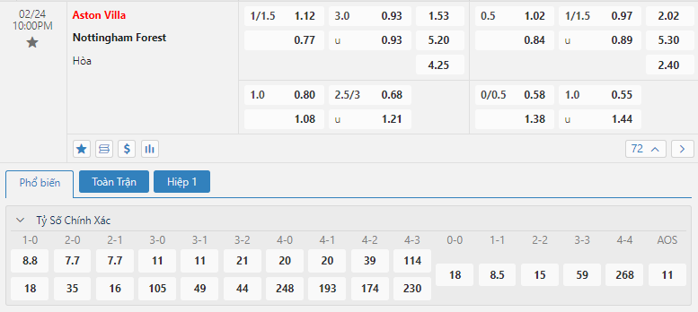 Bảng tỷ lệ kèo bóng đá trận đấu Aston Villa vs Nottingham Forest