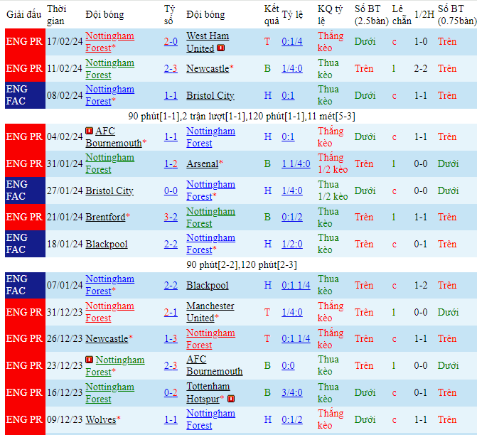 Trong khi đó với Nottingham Forest, binh đoàn áo đỏ cũng đã chính thức có được niềm vui chiến thắng sau khi đánh bại West Ham với tỉ số 2-0 ở vòng đấu vừa rồi. Kết quả chính là sự giải thoát dành cho The Red khi mà họ đã chấm dứt đi chuỗi 4 vòng đấu liên tiếp không biết đến niềm vui trước đó. Dù vậy thì có lẽ Nottingham Forest cũng không nên quá chủ quan khi mà với 24 điểm mà họ đang có được, khoảng cách với nhóm cầm đèn đỏ cũng chỉ đang là 5 điểm lúc này. Phải làm khách trên sân của Aston Villa ở vòng đấu tới vẫn sẽ mang đến cho họ những nỗi lo. Trận đấu sẽ là sự kiểm soát của đội chủ nhà, khả năng cũng sẽ có nhiều bàn thắng xuất hiện.