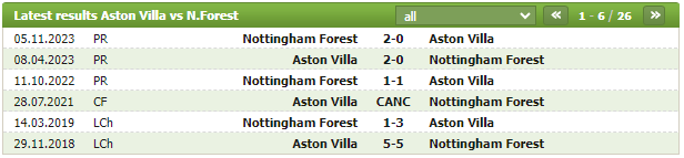 Lịch sử thi đấu của Aston Villa vs Nottingham Forest