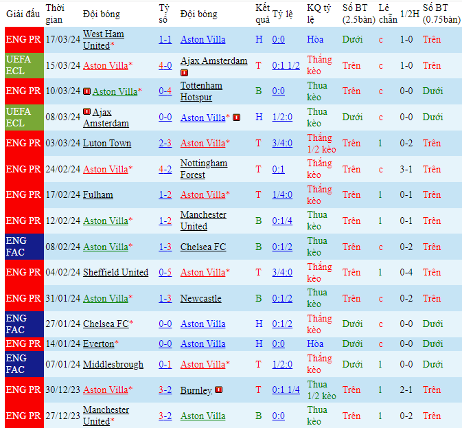 -Phong độ Aston Villa