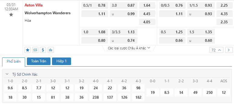 Kèo châu Âu cũng đang là sự ưu thế cho đội chủ nhà khi mức ăn của Aston Villa đang là 1.64 trong khi đó con số này của Wolves đã là 4.45. Một khoảng thời gian vô cùng khó khăn và hơn lúc nào hết Aston Villa sẽ cần phải có được sự quyết tâm vươn lên cùng với đó là những giải pháp để đưa mình trở lại với guồng quay hiện tại. Các lợi thế đang có sẽ là cơ sở để họ có thể nghĩ đến một chiến thắng trước Wolves ở trận đấu tới.