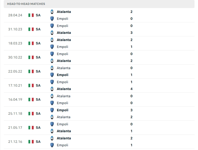 Lịch sử thi đấu của Atalanta vs Empoli
