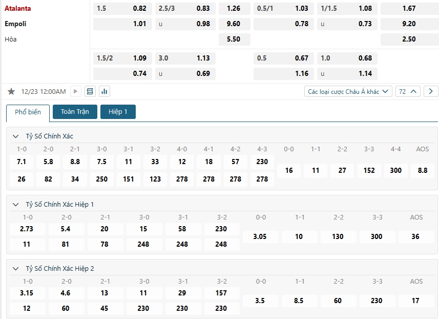 Kèo Châu Âu hiện vẫn đang là sự nhỉnh hơn dành cho đội chủ nhà, khi mức ăn của họ là 1.26 và con số này của các vị khách Empoli đã là 9.60. Điều này cho thấy giới chuyên môn vẫn đánh giá rất cao khả năng giành trọn 3 điểm của Atalanta, đặc biệt khi họ được chơi trên sân nhà và đang sở hữu phong độ thăng hoa cùng lối chơi tấn công cực kỳ hiệu quả.