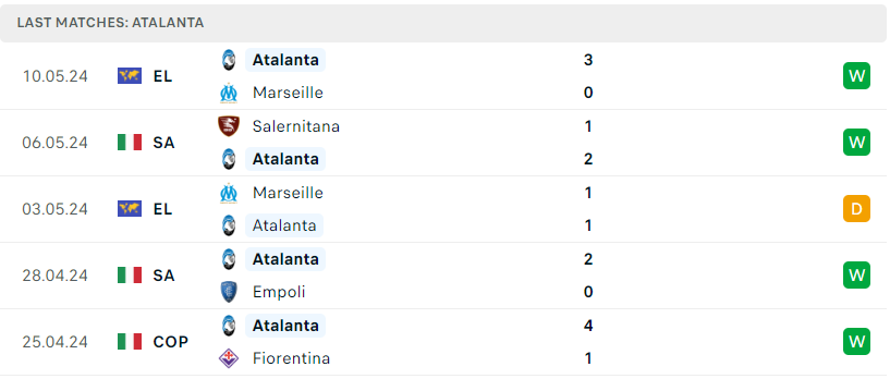 Thắng lợi 3 sao trước Marseille tại bán kết lượt về cup C2 trên sân nhà đã giúp Atalanta nhẹ nhàng tiến bước vào chung kết đấu trường Europa League. Bên cạnh đó, Le Dea còn lọt đến chung kết một giải đấu khác là Coppa Italia và tại đây họ sẽ có màn đụng độ Juventus trên sân Olimpico vào giữa tuần. Cơ hội sẽ được chia đều cho cả đôi bên và liệu cái tên nào sẽ trở thành tân vương tại cup quốc gia ?