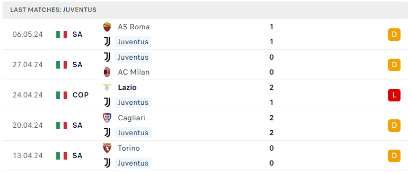 Bên phía kia, phong độ của Juventus trong giai đoạn nước rút của mùa giải là cực kỳ thất vọng khi thống kê chỉ ra rằng Lão Bà thành Turin chỉ thắng 2/10 vòng đấu gần nhất. Đáng ngại hơn, đoàn quân Max Allegri đã bị đẩy xuống vị trí thứ 4 trên BXH và đang cận kề với việc đánh rơi tấm vé tham dự cup C1 mùa sau. Vẫn còn rất nhiều điều phải cải thiện nếu Juventus muốn tham dự cuộc đua đường dài tại Serie A mùa sau.