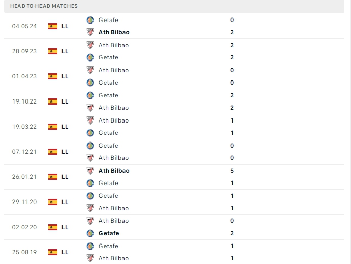 Lịch sử thi đấu của Athletic Club vs Getafe
