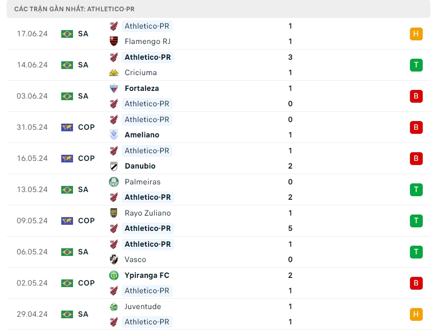 Phong độ đội bóng Athletico -PR vs Corinthians