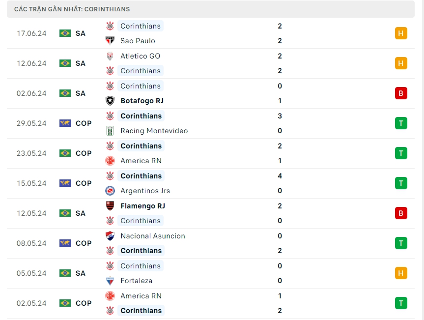 Trong khi đó với Corinthians, trận hòa 2-2 trước Sao Paulo vừa qua là trận hòa thứ 2 liên tiếp của họ và cũng là trận hòa thứ 4 của họ sau 9 lượt trận, với chỉ 1 chiến thắng và 4 thất bại, có được 7 điểm và đang xếp vị trí thứ 16 trên BXH, hàng công của Corinthians đang thi đấu không tốt khi chỉ có được 7 bàn thắng, bên cạnh hàng thủ nhận về 10 bàn thua, 5 trận xa nhà gần nhất hàng công của Corinthians có cho mình 6 bàn thắng và hàng thủ nhận 6 bàn thua.