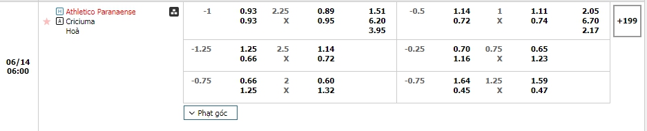 Kèo châu Âu cũng đang là sự ưu thế cho đội chủ nhà khi mức ăn của Athletico-PR đang là 1.51 trong khi đó con số này của Criciuma đã là 6.20. Ưu thế sân nhà và đón tiếp một đối thủ đang gặp nhiều khó khăn về mặt phong độ cộng với đó là sự vượt trội trong những lần đối đầu sẻ giúp Athletico-PR tự tin hướng đến chiến thắng cho mình.