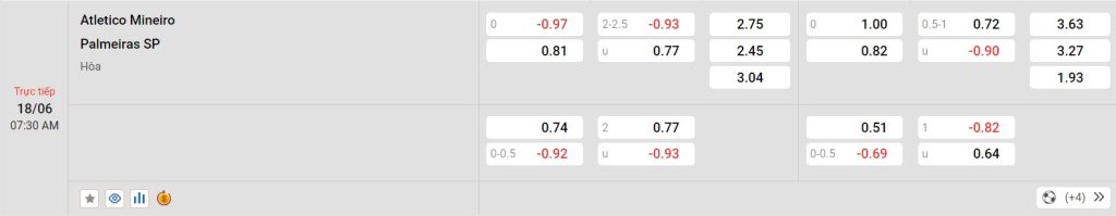 Bảng tỷ lệ kèo bóng đá trận đấu Atletico Mineiro vs Palmerias