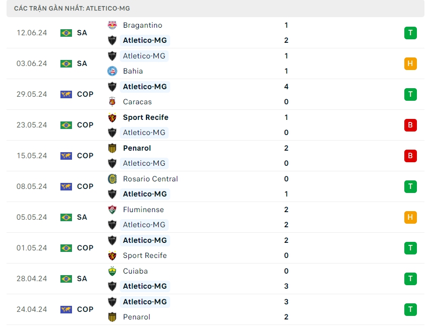 -Phong độ Atletico Mineiro