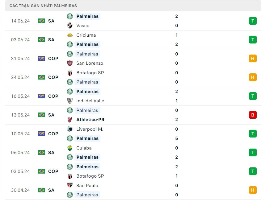 Phong độ đội bóng Atletico Mineiro vs Palmerias
