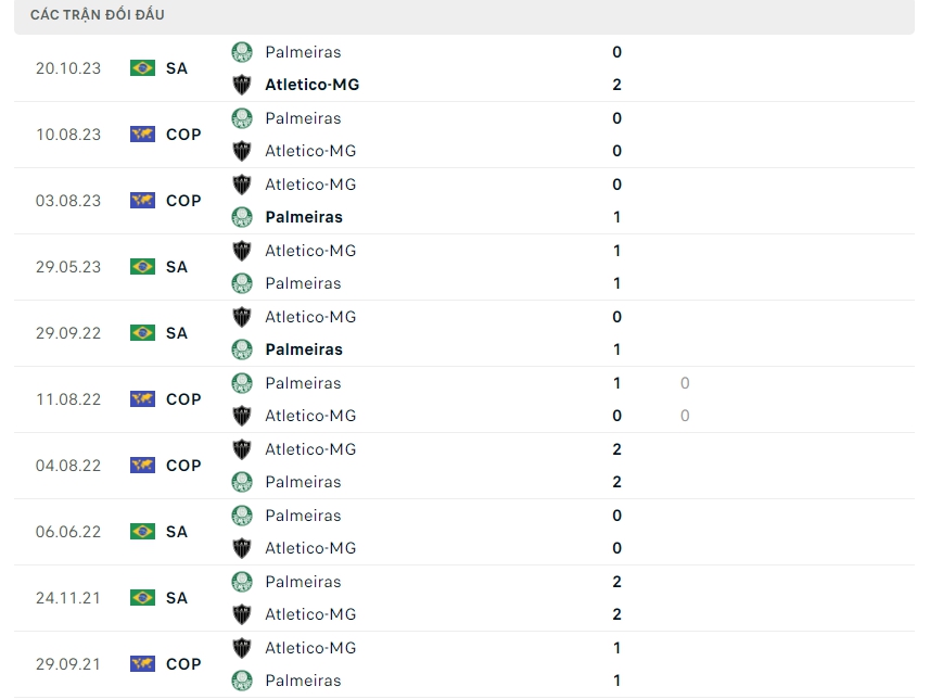 Lịch sử thi đấu của Atletico Mineiro vs Palmerias
