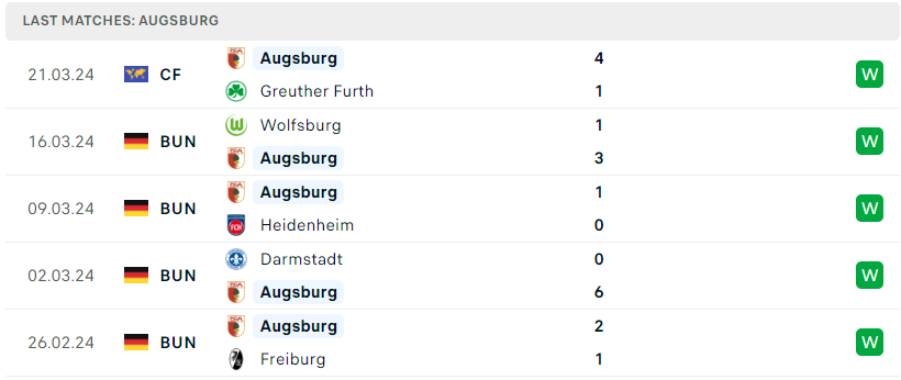 Sự thăng hoa đang tiếp tục được Augsburg lột tả bằng trận thắng hủy diệt 3-1 trước Wolfsburg ở vòng đấu gần nhất. Đáng chú ý, đó đã là chiến thắng thứ 4 liên tiếp của tập thể này tại Bundesliga. Phong độ chói sáng cùng với một lịch thi đấu thuận lợi đã nhanh chóng đưa Augsburg trở lại vị trí thứ 7 trên BXH và hiện cũng chỉ kém nhóm giành vé dự cup Châu Âu mùa sau đúng 5 điểm. Màn tiếp đón FC Koln sắp tới đây được xem là cơ hội quá tốt để họ nối dài mạch thắng.