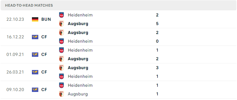 Sự áp đảo một lần nữa được Augsburg thể hiện qua thành tích đối đầu, khi cụ thể đội bóng này đã toàn thắng trong cả 4 lần đụng độ gần nhất. Với sự trái ngược về phong độ, chắc chắn sẽ dẫn đến kết quả khả quan dành cho đội bóng có phong độ tốt hơn. Chưa nói, Augsburg còn đang trong trạng thái thăng hoa trở lại. Vì thế, đôi chút sự khởi sắc của Heidenheim vẫn là chưa đủ để cản bước đội chủ nhà.