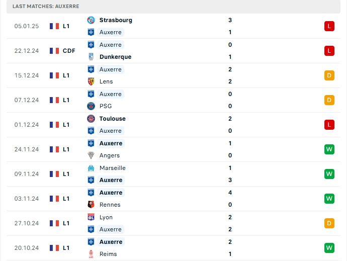 Auxerre vừa qua nhận thất bại trước Strasbourg, đây là trận không thắng thứ 5 liên tiếp của họ, trải qua 16 lượt trận, Auxerre có được 6 chiến thắng, 3 hòa cùng 7 thất bại, có được 21 điểm và đang xếp vị trí thứ 9 trên BXH, hàng công của Auxerre mang về 24 bàn thắng cùng hàng thủ nhận 26 bàn thua sau 16 trận đấu, 3/5 trận vừa qua của Auxerre khép lại không quá 2 bàn, trên sân nhà của mình Auxerre mang về 14 bàn thắng cùng hàng thủ nhận 7 bàn thua sau 8 trận đấu.