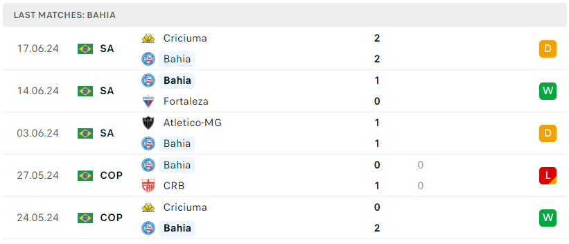 Phong độ đội bóng Bahia vs Cruzeiro