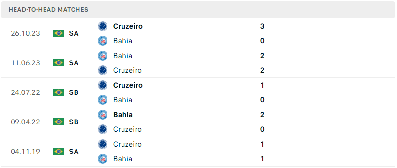 Thành tích đối đầu của Bahia vs Cruzeiro