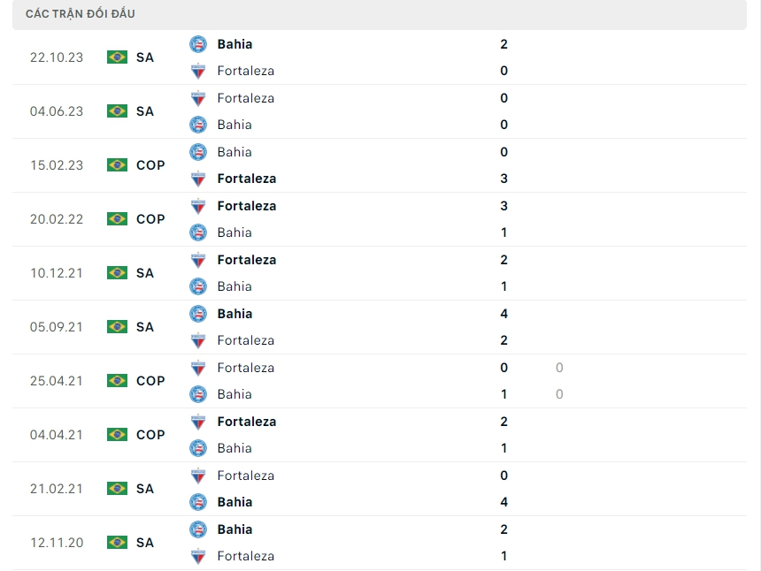 Lịch sử thi đấu của Bahia vs Fortaleza