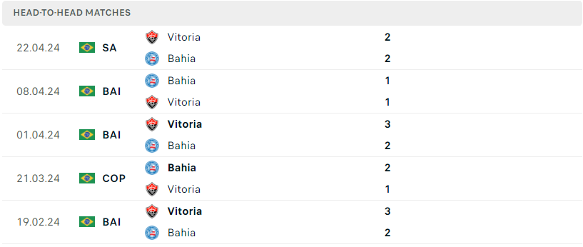 Trong cuộc chạm trán ở lượt đi mùa giải này, Bahia cũng đã xuất sắc cầm chân đối thủ với tỉ số 2-2 ngay trên sân của Vitoria. Thậm chí, nếu thi đấu đủ an toàn thì thầy trò Rogério Ceni còn có thể mang về 3 điểm. Màn tái đấu tới là trận đấu thứ 5 mà đôi bên gặp nhau trong năm nay và vì thế với bản lĩnh, kinh nghiệm thì tin rằng Bahia sẽ biết cách tối đa hóa lợi thế và giành trọn 3 điểm.