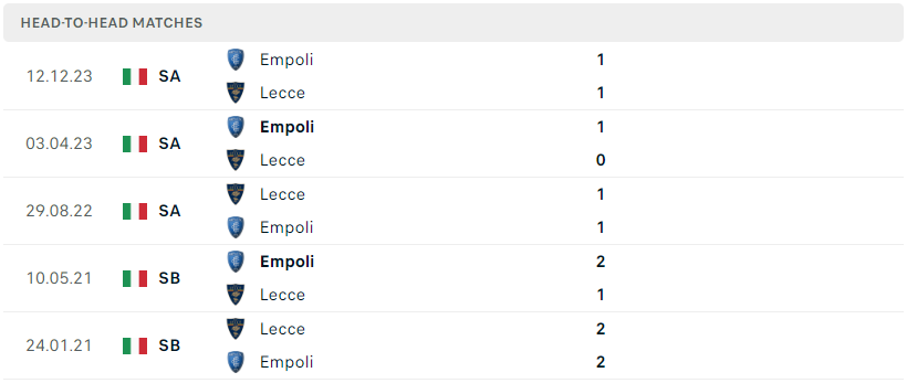 Thành tích đối đầu của Lecce vs Empoli