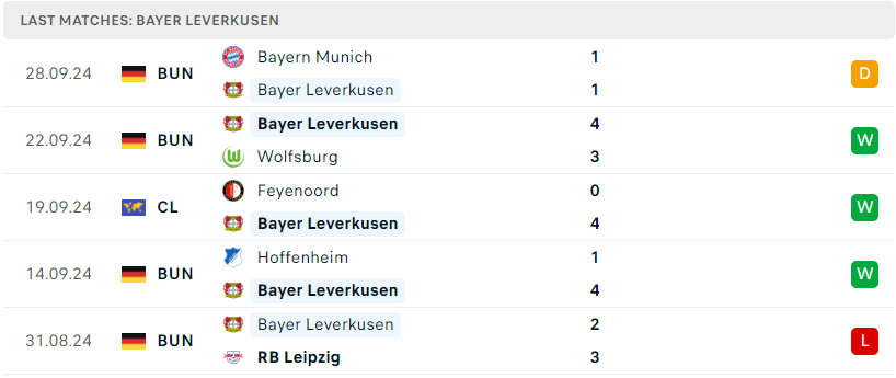 Với vị thế là nhà ĐKVĐ, Bayer Leverkusen đã không làm NHM phải thất vọng khi họ đã mang về 10 điểm sau 5 vòng đấu và hiện đang duy trì sức ép lớn lên cuộc chiến ngôi đầu. Đoàn quân Xabi Alonso đang có phong độ ấn tượng với 4 trận bất bại trong 5 trận gần nhất, bao gồm trận hòa 1-1 trước Bayern Munich vừa qua. Mặc dù “Die Werkself” vừa trải qua một trận đấu khó khăn, nhưng họ vẫn thể hiện được sự kỷ luật trong lối chơi. Trước một tân binh, Leverkusen chắc chắn sẽ đặt mục tiêu 3 điểm.