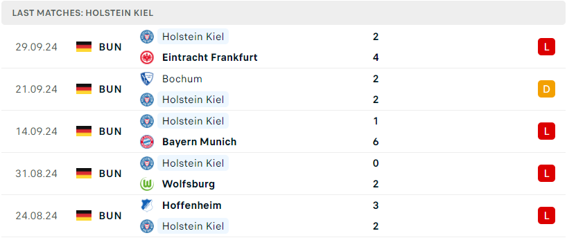 Ngược lại, Holstein Kiel lại đang gặp vô vàng những khó khăn trong lần đầu tiên góp mặt tại Bundesliga, đơn cử là việc họ chỉ kiếm về duy nhất 1 điểm sau 5 vòng đấu đầu mùa. Trận hòa 2-2 trước Bochum chính là màn trình diễn tốt nhất của thầy trò Marcel Rapp, thế nhưng nhìn chung so với mặt bằng chung thì Holstein Kiel vẫn còn kém xa. Nếu không nhanh chóng tìm ra sự bứt phá mạnh mẽ, thì chắc chắn ngày trở lại Bundesliga 2 sẽ không còn xa với tập thể miền Bắc nước Đức.