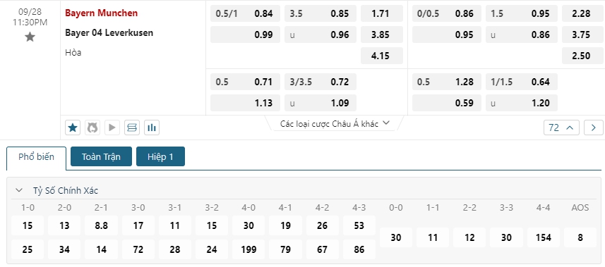 Bảng tỷ lệ kèo bóng đá trận đấu Bayern Munich vs Bayer Leverkusen