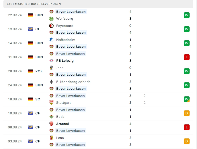 Trong khi đó với Bayer Leverkusen, sau 4 lượt trận với 3 chiến thắng và 1 hòa thì hiện tại nhà ĐKVĐ có cho mình 9 điểm và đang xếp vị trí thứ 2 trên BXH, họ kém 3 điểm so với đối thủ trong trận đấu này, hàng công của các vị khách đang thi đấu tốt với 13 bàn thắng có được, tuy vậy hàng thủ chơi tệ khi nhận đến 9 bàn thua là yếu tố khiến Bayer Leverkusen có những trận đấu khá chật vật vừa qua, cả 4 trận đấu đó đều khép lại 90 phút vượt mốc 3 bàn, khi thi đấu xa nhà, hàng công mà HLV Xabi Alonso xây dựng có được 13 bàn thắng cùng hàng thủ nhận 7 bàn thua, 4/5 trận đấu đó khép lại 90 phút vượt mốc 3 bàn.