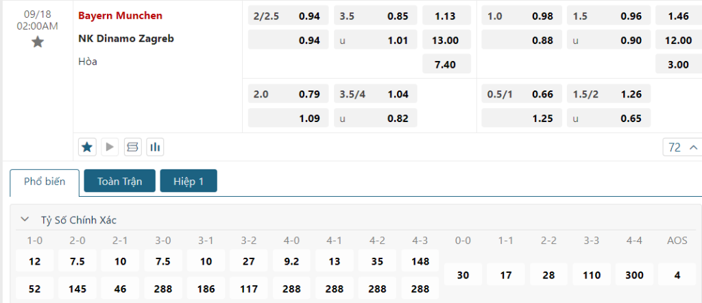 Bảng tỷ lệ kèo bóng đá trận đấu Bayern Munich vs Dinamo Zagreb