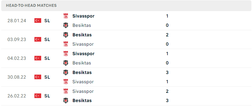 Thành tích đối đầu của Besiktas vs Sivasspor