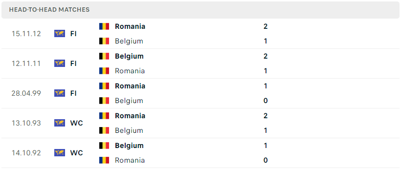 Thành tích đối đầu của Bỉ vs Romania