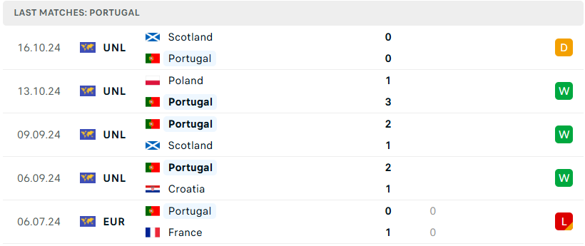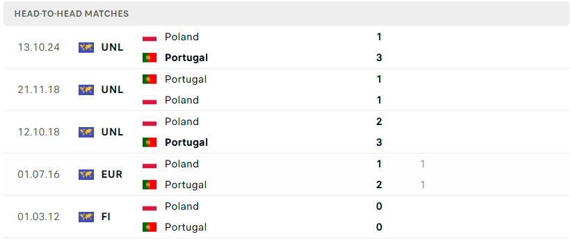 Lịch sử thi đấu cũng chỉ ra rằng Bồ Đào Nha đang tỏ ra áp đảo khi bất bại trong 5 lần chạm trán gần nhất. Điều này cho thấy Bồ Đào Nha không chỉ có lợi thế về lực lượng và phong độ hiện tại mà còn sở hữu tâm lý tự tin khi đối đầu với Ba Lan. Một lối chơi vào form sẽ giúp thầy trò Martínez dễ dàng có được thế trận và chiến thắng cách biệt.